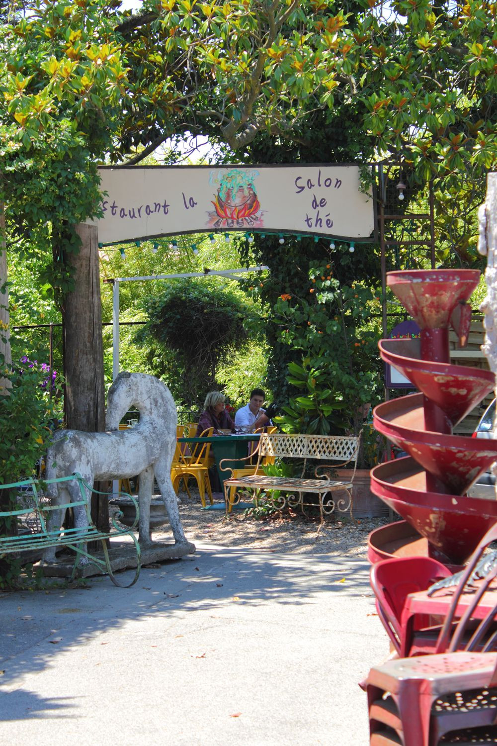 「Restaurant」「Salon de thé」と書かれた看板。 木陰のテーブルで、ゆっくりと過ごす人たち。